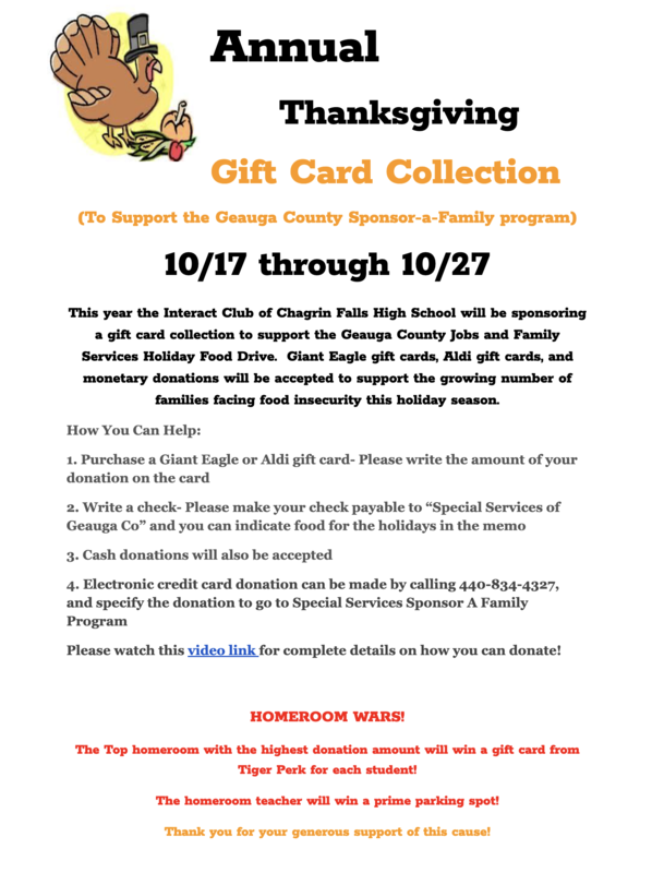 Electronic credit card donations can be made by calling 440-834-4327. Please specify their donation to go to Special Services Sponsor a Family Program. Gift cards and cash donations can be turned in to the students’ homerooms.